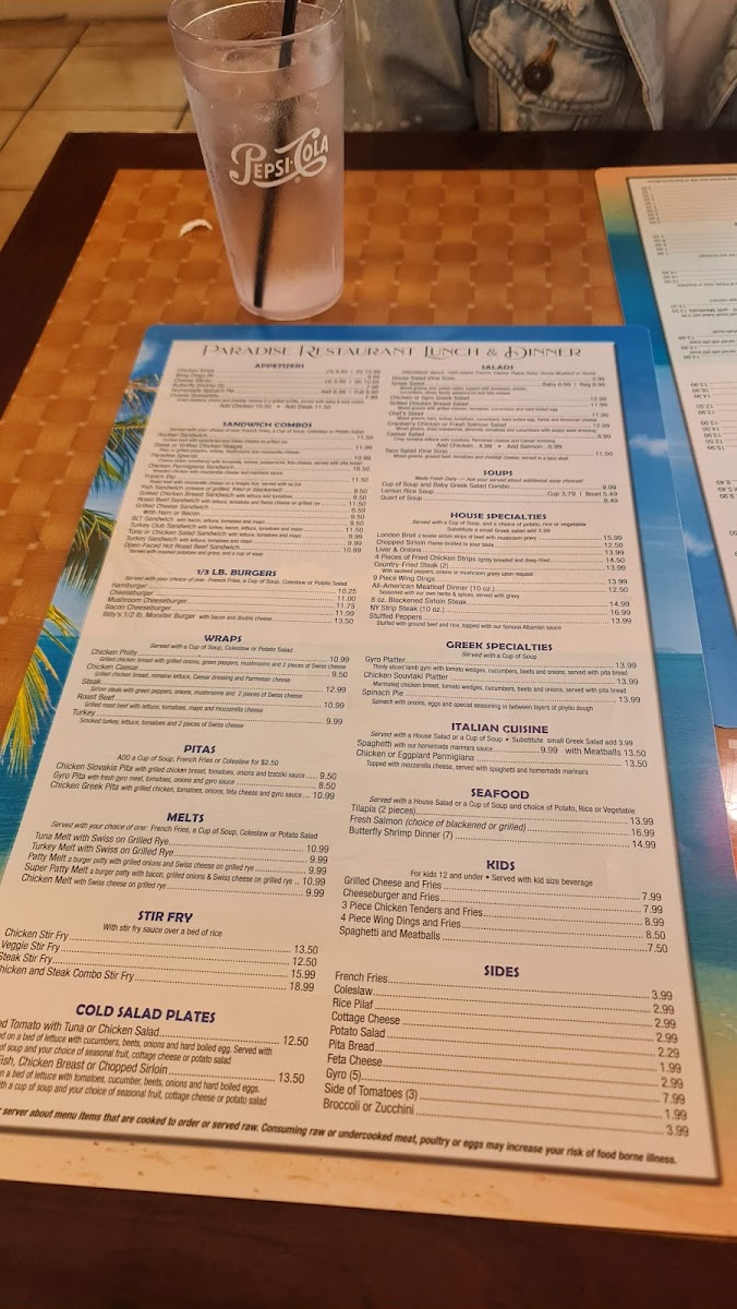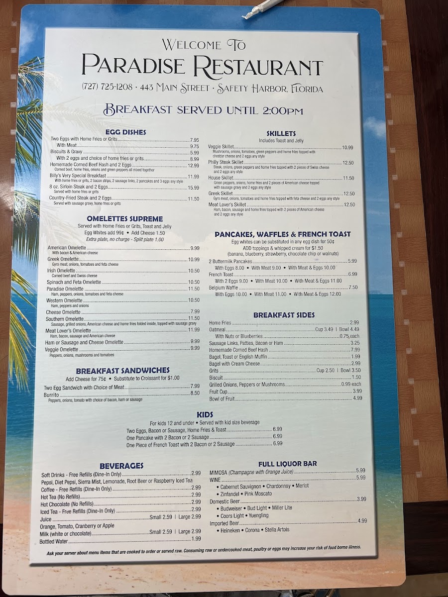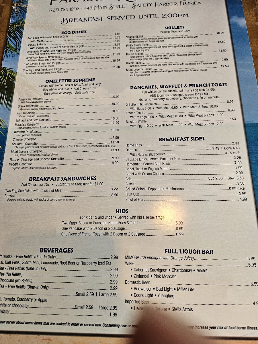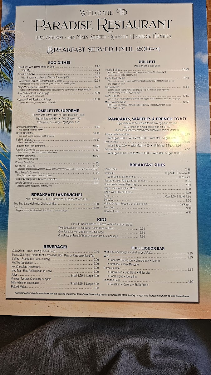 Welcome to Paradise Restaurant, a charming breakfast spot that brings a warm, family-friendly vibe to downtown Safety Harbor. Located at 443 Main St, this quaint diner-style eatery is perfect for starting your day right. Their extensive menu features mouthwatering options like the Tuna Melt on grilled rye for $10.99 and delectable skillets, including the Greek Skillet for $12.50. Appetizers such as Wing Dings and Cheese Sticks are ideal for sharing or keeping all to yourself.