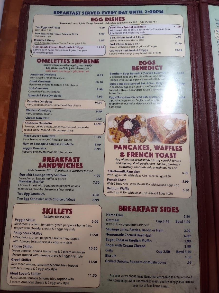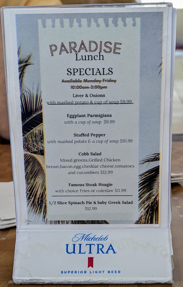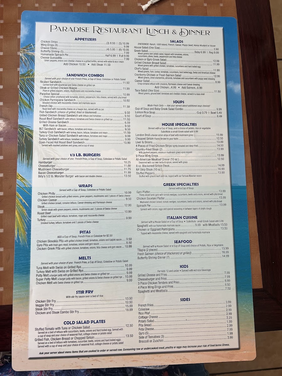 Welcome to Paradise Restaurant, a charming breakfast spot that brings a warm, family-friendly vibe to downtown Safety Harbor. Located at 443 Main St, this quaint diner-style eatery is perfect for starting your day right. Their extensive menu features mouthwatering options like the Tuna Melt on grilled rye for $10.99 and delectable skillets, including the Greek Skillet for $12.50. Appetizers such as Wing Dings and Cheese Sticks are ideal for sharing or keeping all to yourself.